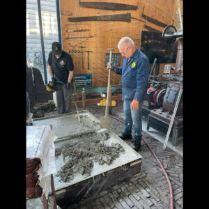 Maar het lukte, dus iedereen blij. Na het uitharden van het beton kon de assemblage pas echt beginnen. Met hulp |van een driepoot, takels, veel mankracht en nog veel meer inventiviteit.