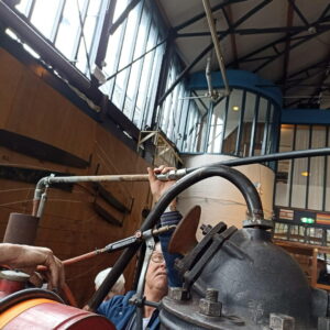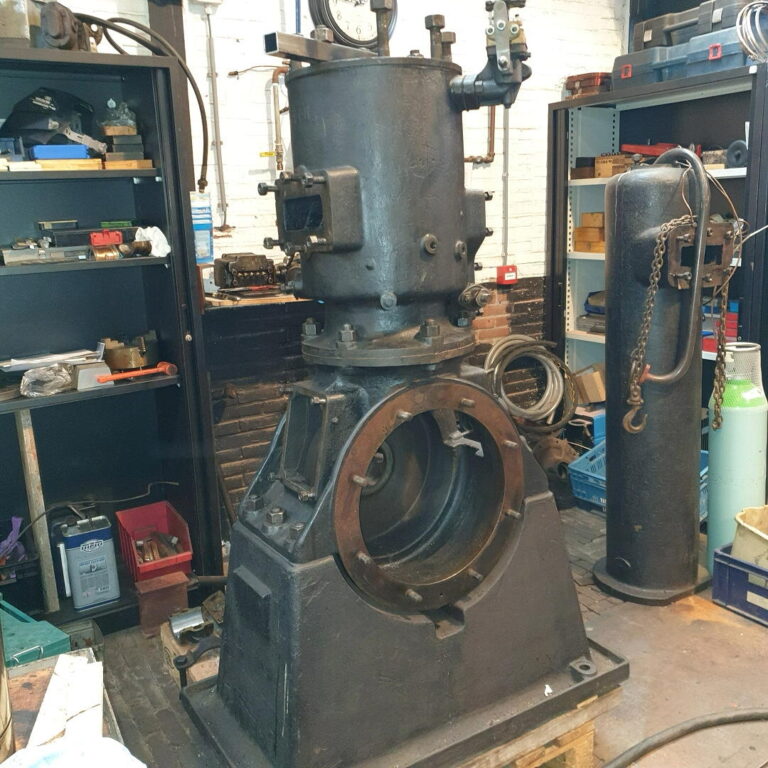 En dat hebben we geweten. Wat lek kon zijn was lek. Ook niet zo gek na 100 jaar. We hebben zo’n beetje alle flens- en koordafdichtingen vervangen. Voor de warmte afvoer gebruiken we een gietijzeren ledenradiator. En er is een open expansievat in het systeem opgenomen met vlotter om het watergebruik te monitoren. Daarmee was technisch gezien het project afgerond.